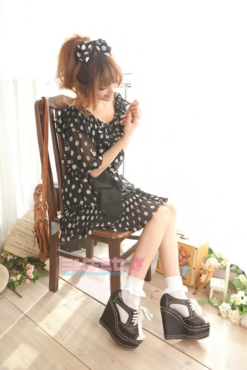 A lovely, sophisticated vintage style, this polka dot dress has a fresh retro/classic feel, with a flowing style and ribbon belt. Elasticated around the ruffled collar, it can be worn naturally or around the shoulders for a brighter summery look. The material is textured chiffon, nice and light.