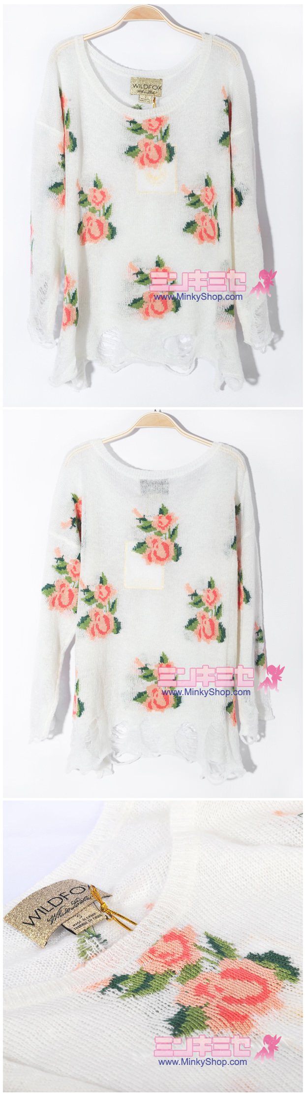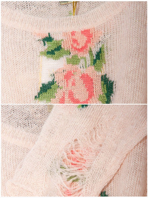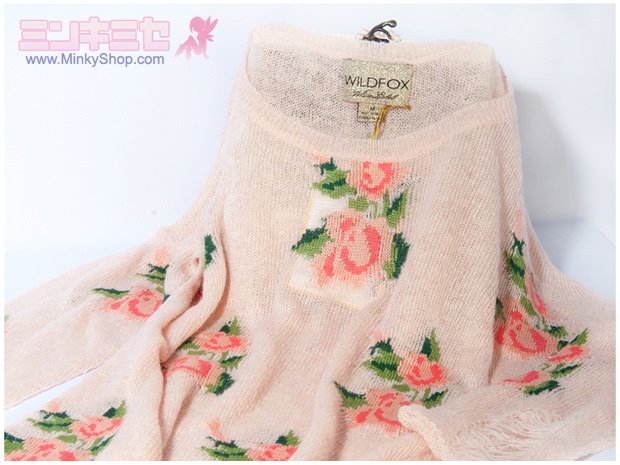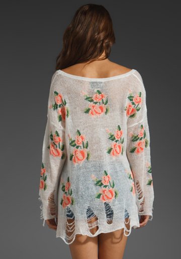 The latest Wildfox Couture Prairie Rose Lennon Sweater from the Wildfox White Label Spring Collection. A super soft, light and relaxed fit pullover sweater in the popular "Lennon" cut, this is the same style as the famous Seeing Stars sweater, with fraying and holes at the hem lines and sleeves. Lightweight sheer knit, it looks stunning layered over a nude bodice or other undershirts. Adorably pretty mini rose patterning is detailed over the front and back, it's blend of cute delicate styling with a hint of grunge makes this knit so unique.