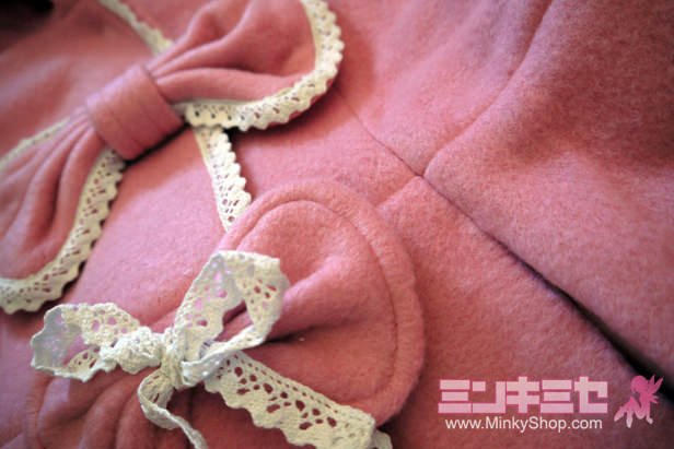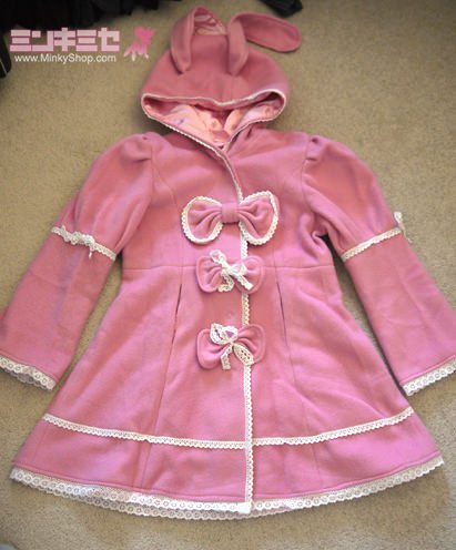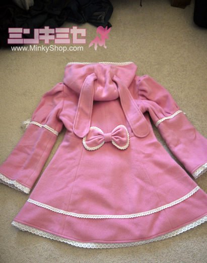 This listing is for a beautifully crafted tailor made bunny wool coat adorned with bows, delicate lace and two floppy bunny ears. Great quality! This is a completely unique lolita piece and a popular favorite. Please note that in the model photos you can see a petticoat peeking out under the hem - this is not included!